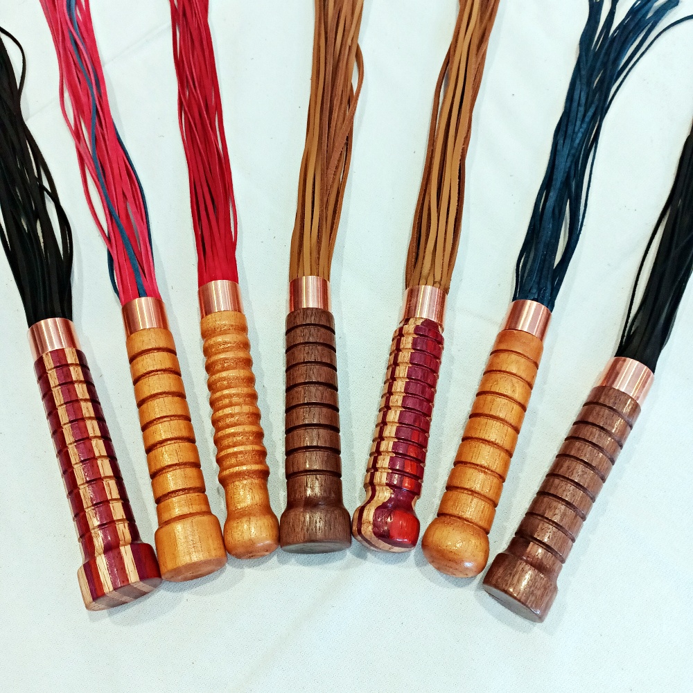 Small and Stingy! Hardwood and copper handles, with leather cord tails. Some cording is stiffer, some softer, so you can choose the sting level that you like.