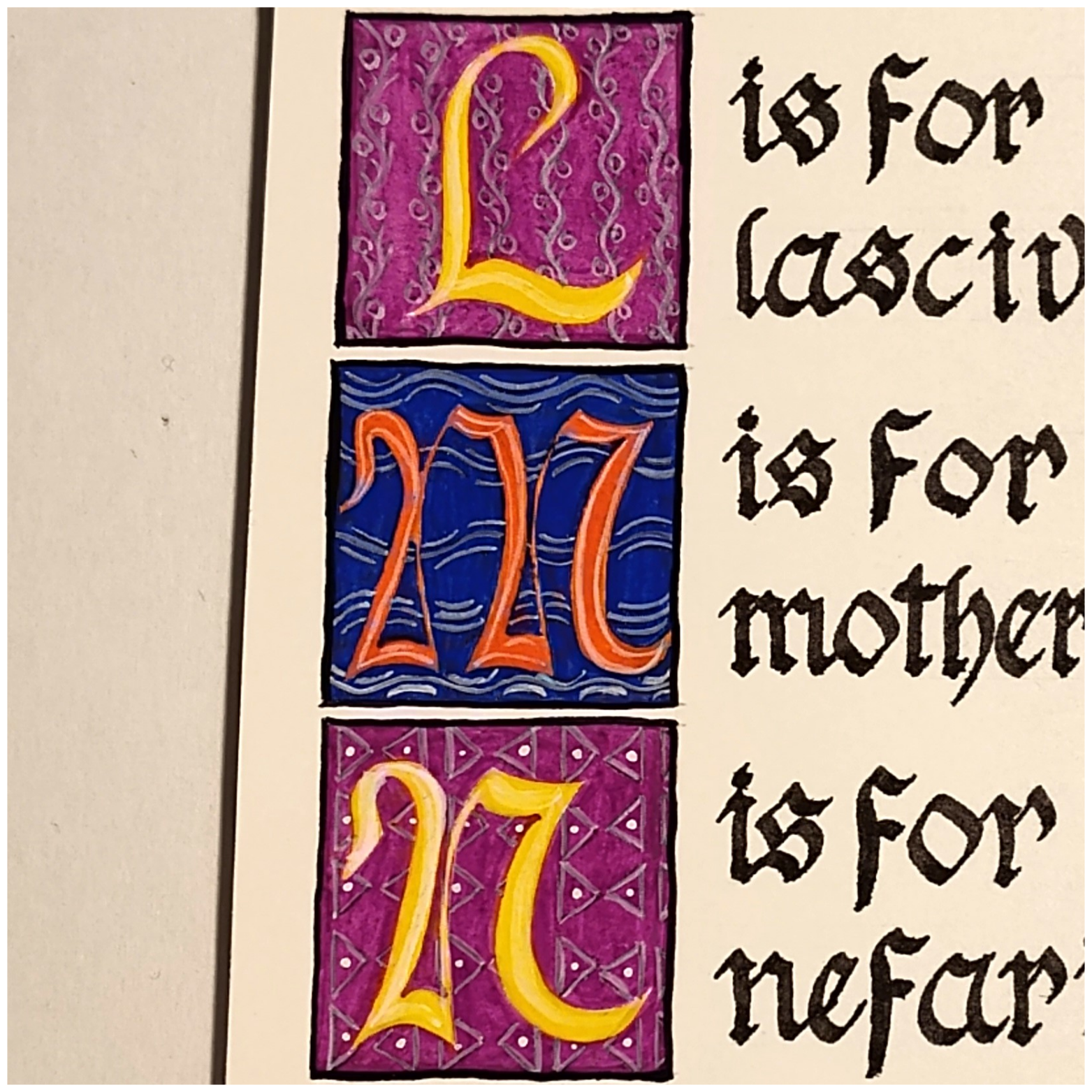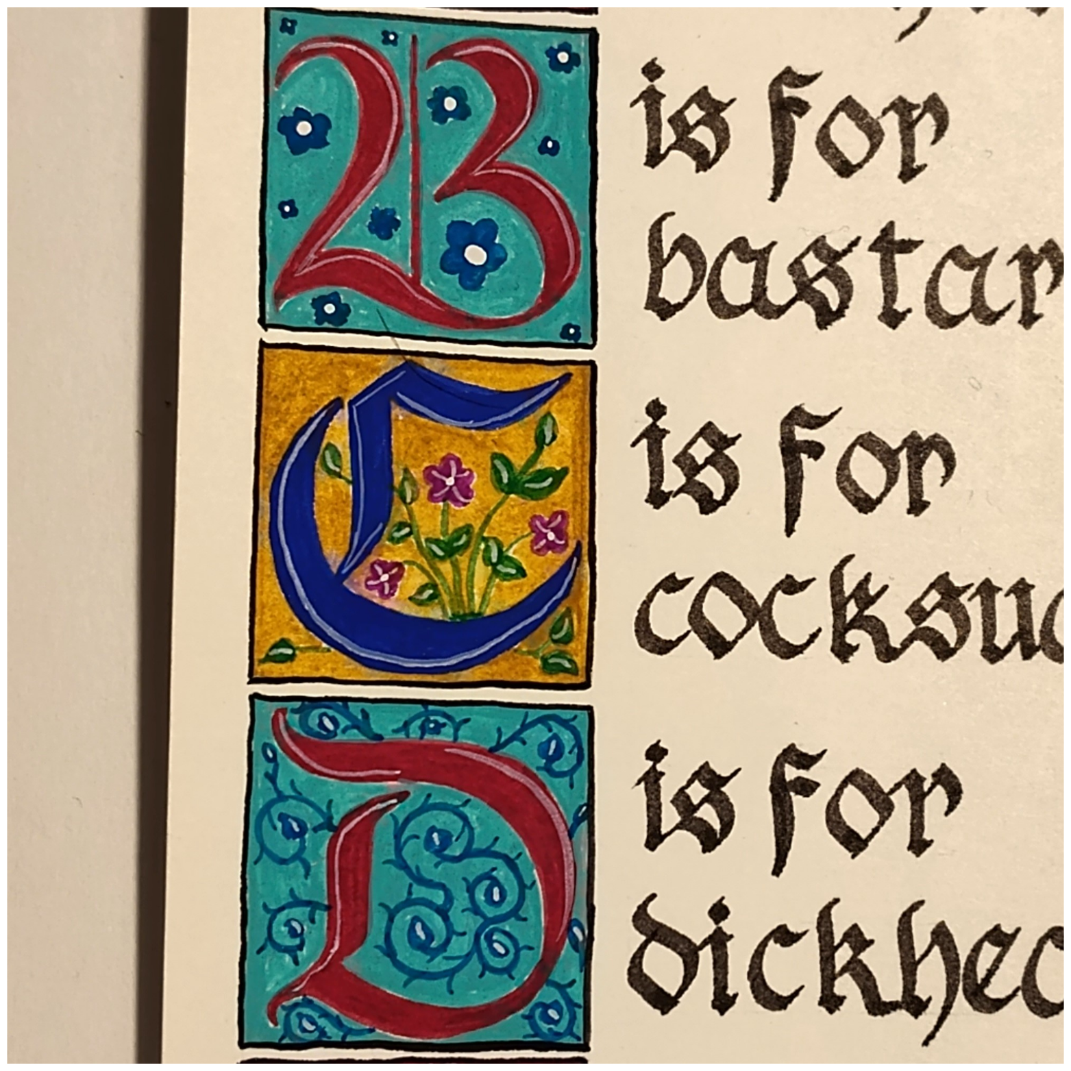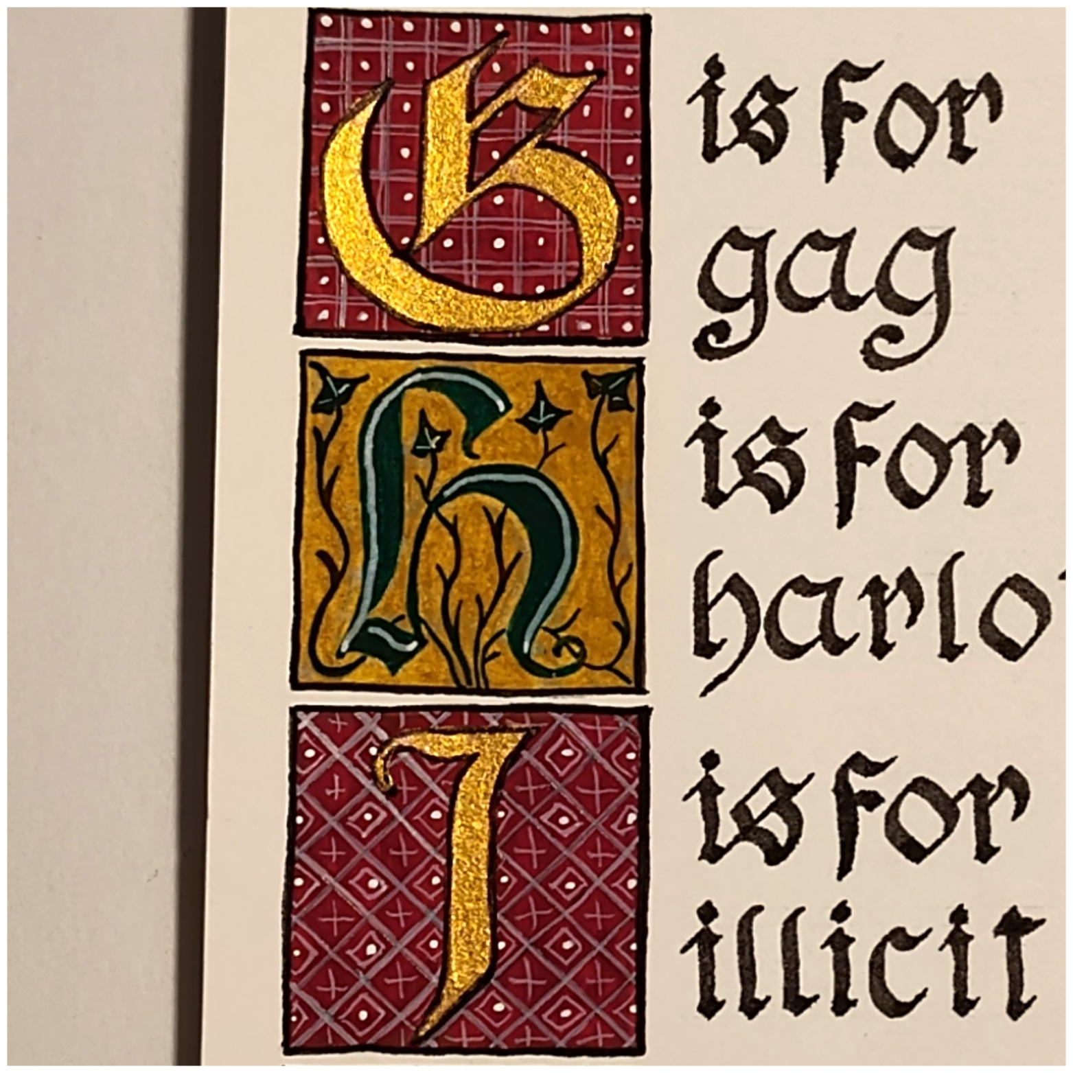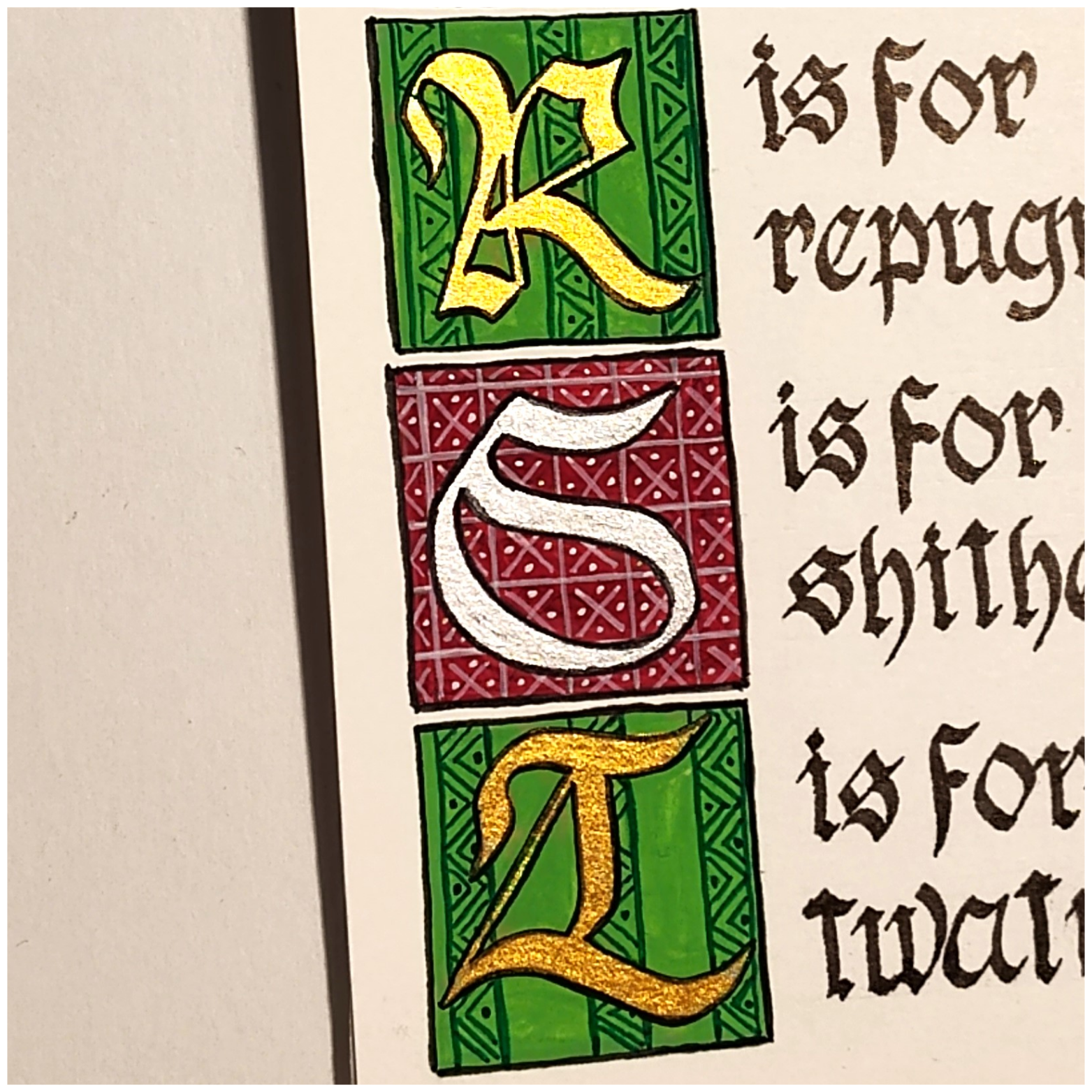 Each letter is inside a 1″ square with individual designs and took almost an hour to paint. The metallic gold and silver paints shine brightly in the originals and each set of letters stands well on its own or the entire set can be purchased, then framed and grouped into a lovely display…as long as small children aren’t around.
