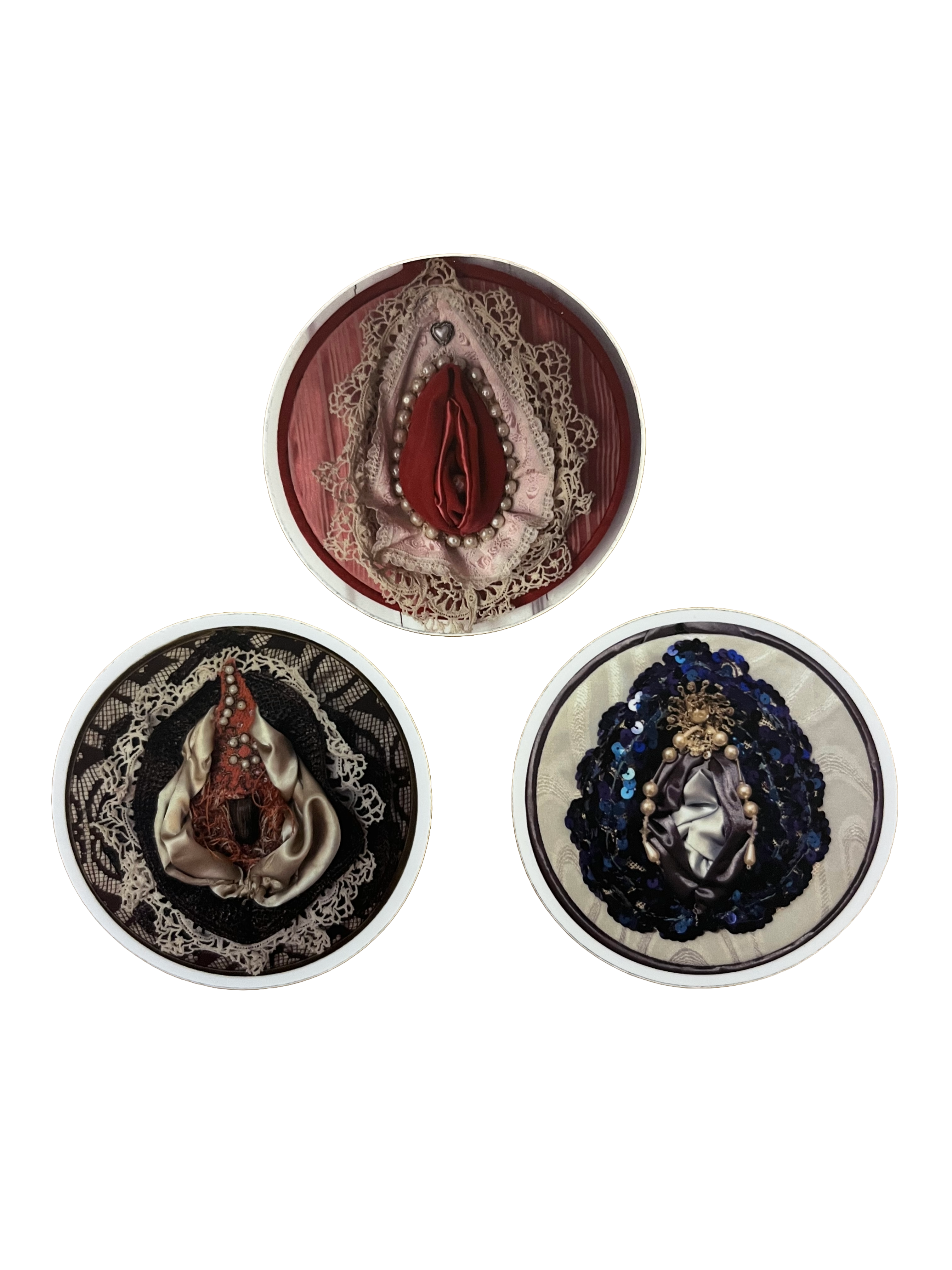 Trio of 3″ round stickers depicting erotic fiber art sculptures created by Starshine5000