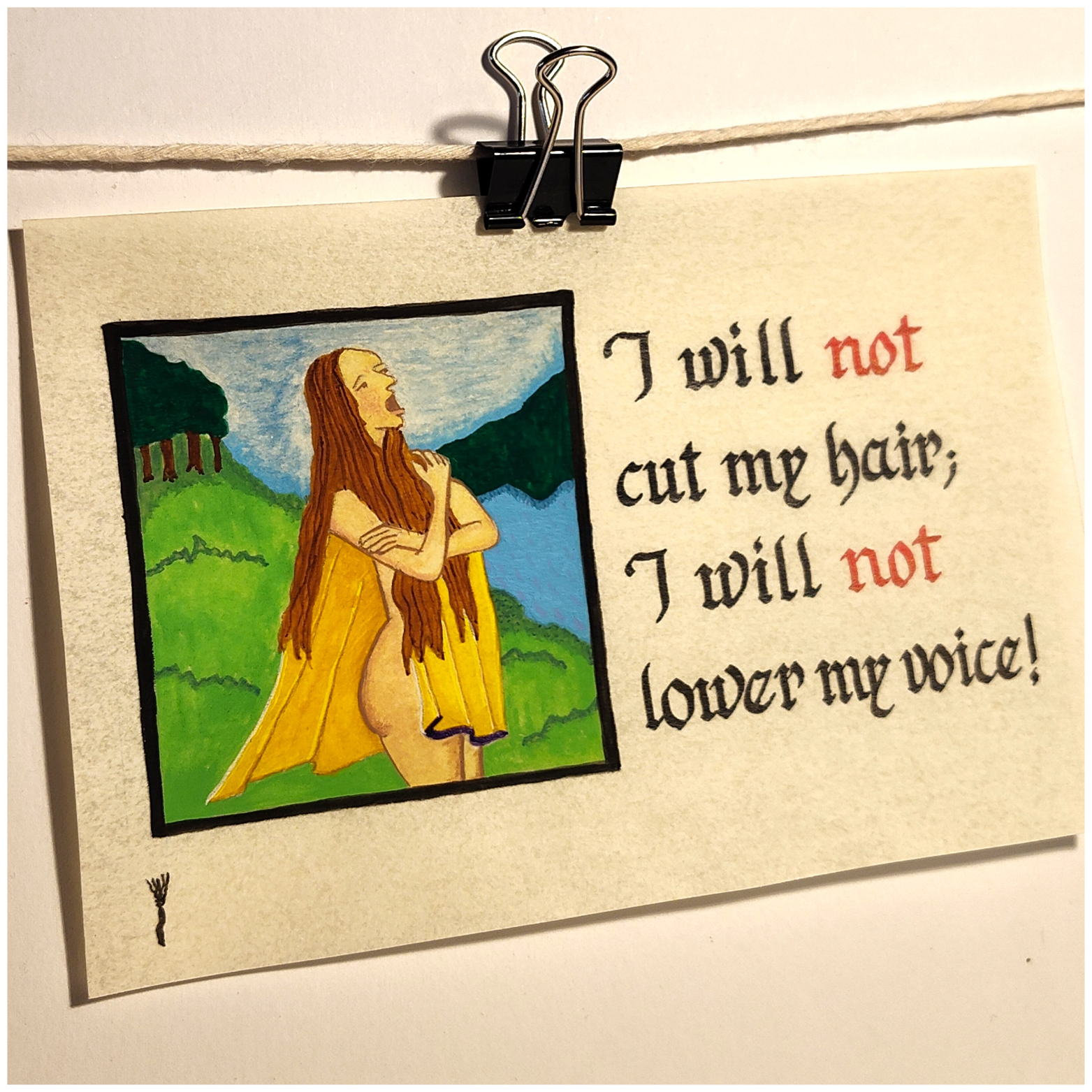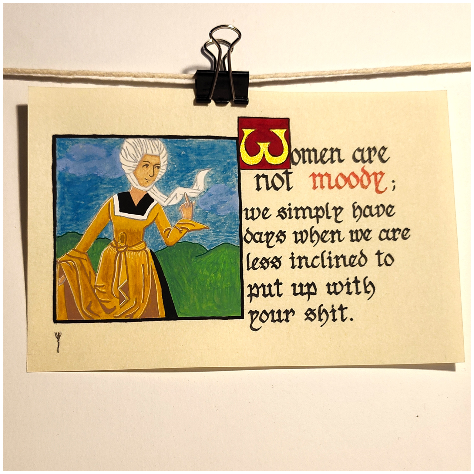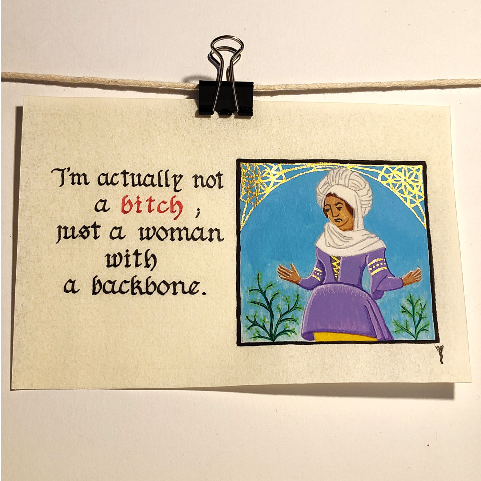 Each one is 4″x6″ and the images are based on images from the 14th century manuscript Des cleres et nobles femmes by Giovanni Boccaccio.